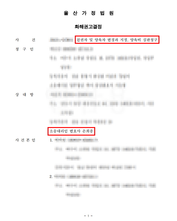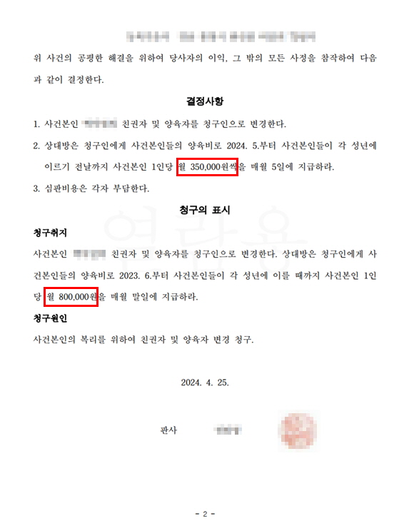 이후 변호사의 개입으로 소송 외 합의가 이루어졌고, 의뢰인의 주장이 충분히 받아들여져, 사건본인의 친권양육권은 A씨가 갖되, 양육비는 1인당 35만 원으로 하는 합의를 할 수 있었습니다. 이에 법원도 이러한 합의 내용을 바탕으로 화해권고결정을 내려줌으로써 소송이 마무리되었습니다.