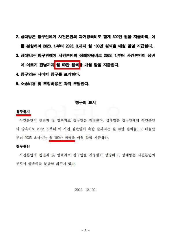 그러자 청구인은 '양육비 없이 혼자 자녀를 키우기 어렵다'며 가정법원에 자녀의 친권자 및 양육자 지정과 함께 월 100만원 씩의 양육비를 청구하는 양육비심판청구를 제기하였습니다.
