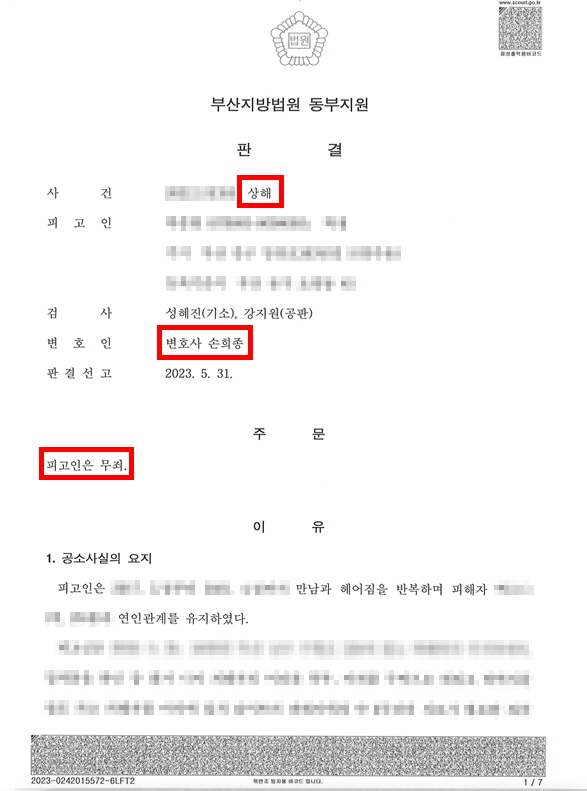 법률사무소 위인은 피해자가 2차 상해의 증거라 제출한 상해진단서는 이미 기소유예 처분을 받은 1차 상해에 의한 것이며, 당일 오후 피고인에 의한 2차 상해가 있었음에 대한 증거가 충분치 않다고 판단, 피고인의 무죄를 주장하였습니다.