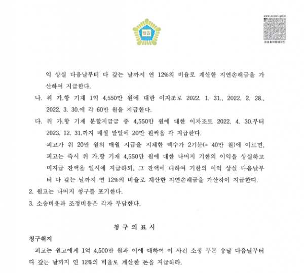 이러한 협의안을 바탕으로 법원에 '조정'을 신청하였고, 아래와 같이 원고와 피고가 협의한 조정안이 받아들여졌습니다.