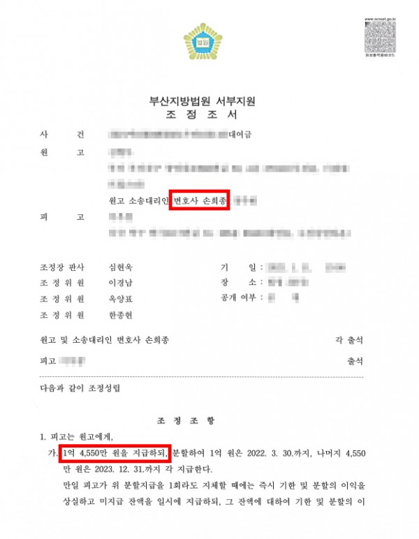 또 사정이 녹록치 않은 피고가 결국 돈을 갚지 못하게 되면 원고가 다음 절차인 채권압류 및 추심명령을 진행해야 하는 등 원고의 입장에서도 끝나지 않는 절차로 피로감이 가중될 수 있습니다. 이러한 측면에서 위 성공사례는 '조정'으로써 피고가 구체적으로 대여금 반환을 이행할 수 있는 계획으로 합의한 것이기 때문에 원고와 피고 모두에게 긍정적인 결과를 이끌어 낸 셈입니다.